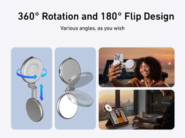 ✅ 360° Rotating Design – Instantly switch between front-facing selfie lighting or background fill light without removing the device.